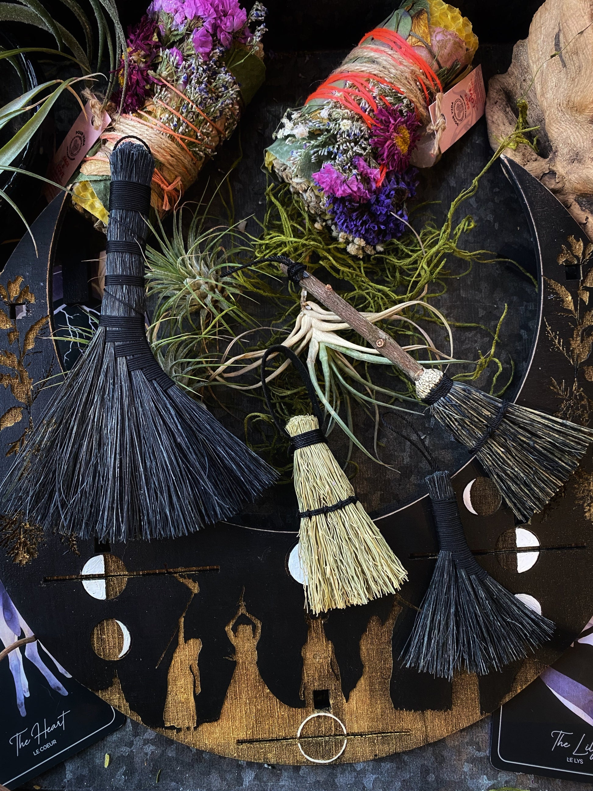 Miniature altar brooms for keeping your sacred space clean or of course they can be used as ornaments. They are made from broomcorn or Tampico and a non-toxic dye.