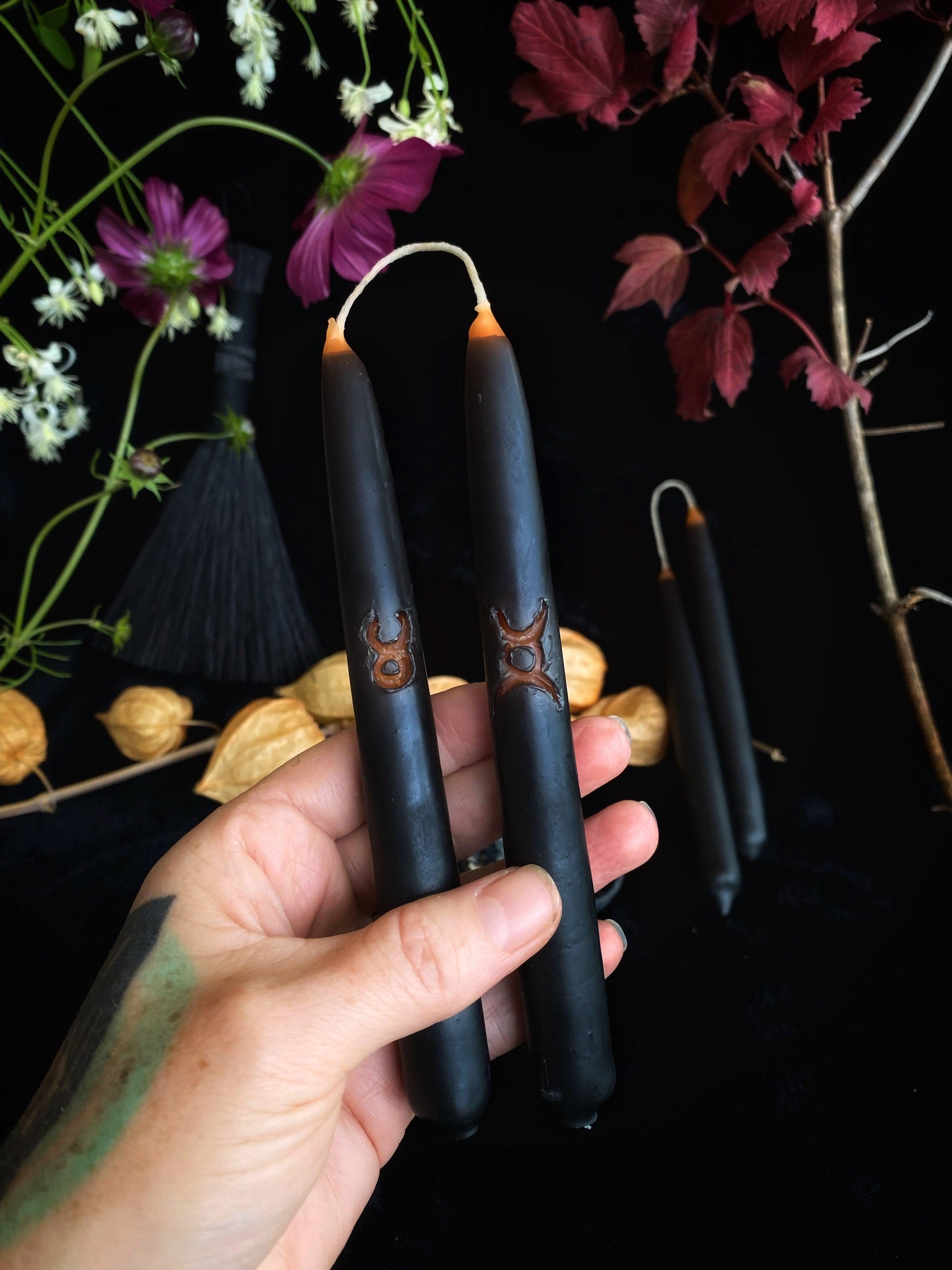 We dip these base color candles we make in some black beeswax for fun carving and two tone color applications such as orange and black for Samhain or red and black for Papa Legba and the crossroads. Basically, you don’t have to buy both colors anymore but they do not come pre-carved. They are blank and ready to add your own spellwork designs.